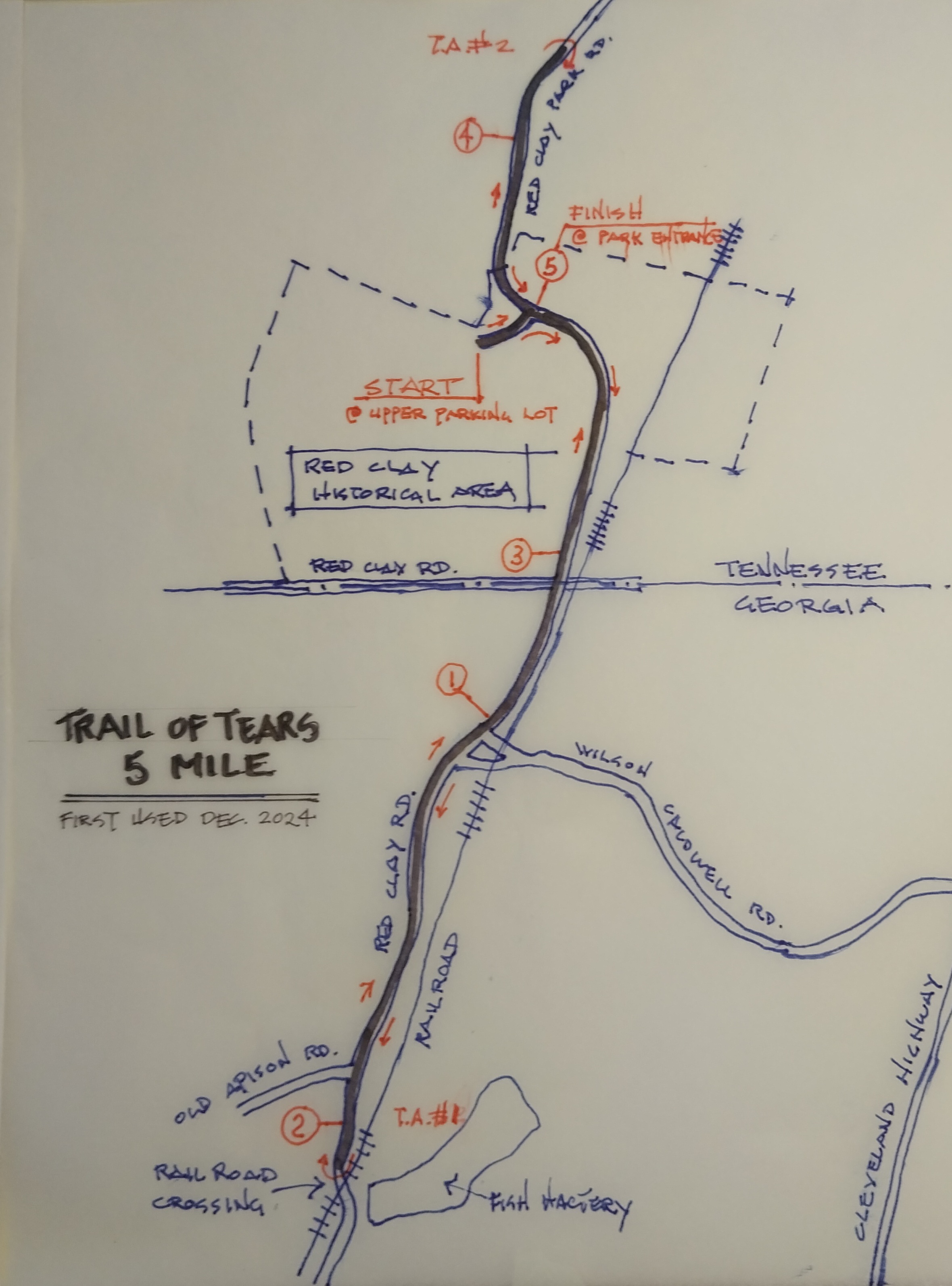 New distance 5 miles. Start and adjacent to the Parks Picnic Shelter. Exit Park right and head South to Cohutta, GA. Crossing state line into Georgia, crossing railroad tracks and evidentially entering Cohutta. Turn left to turn-a-round loop at the elementary school retracing route to the finish at the Park entrance.  Click here to review course map.   The course is flat and fast.